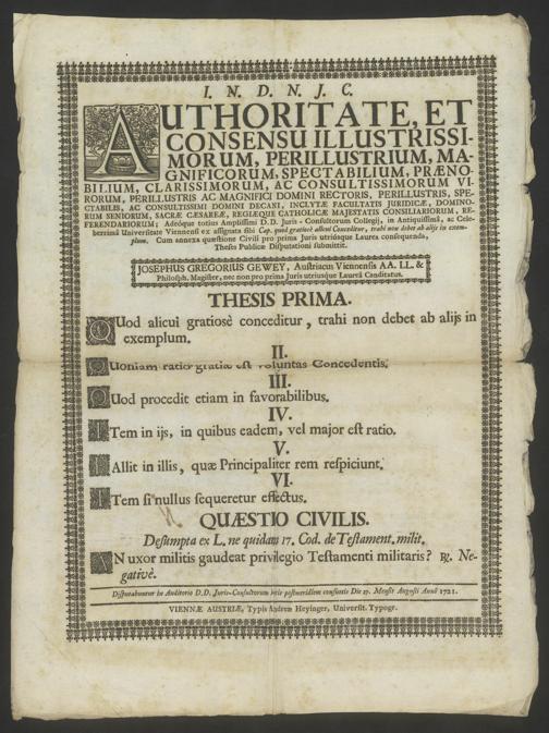- QuellenangabeI. N. D. N. J. C. Authoritate, Et Consensu Illustrissimorum, Perillustrium, Magnificorum, Spectabilium, Prænobilium, Clarissimorum, Ac Consultissimorum [...] : Disputabuntur in Auditorio D.D. Juris-Consultorum horis postmeridiem consuetis Die 27. Mensis Augusti Annô 1721 / Josephus Gregorius Gewey, Austriacus Viennensis AA. LL. & Philosph. [!] Magister, nec non pro prima Juris utriusque Laureâ Candidatus. Viennæ Austriæ : Typis Andreæ Heyinger, Universit. Typogr., 27.8.1721. Wienbibliothek im Rathaus, C-79740, https://resolver.obvsg.at/urn:nbn:at:AT-WBR-126471 / Public Domain Mark 1.0