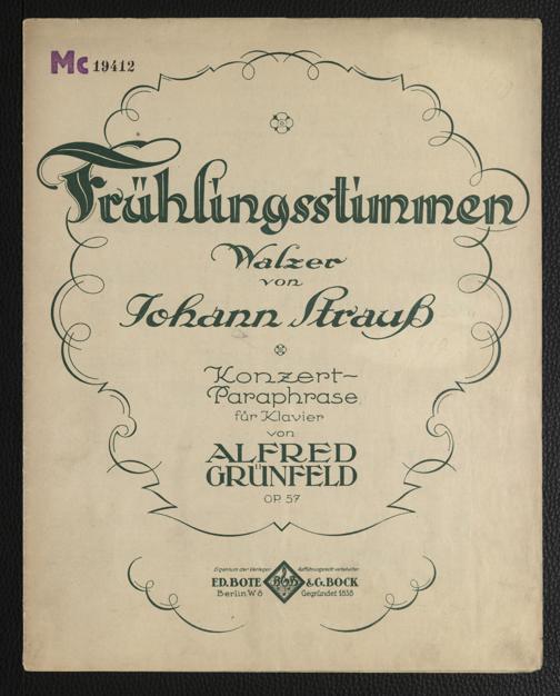 Frühlingsstimmen : Konzertparaphrase für Klavier ; op. 57 / von Joh. Strauss; von Alfr. Grünfeld. Berlin : Bote & Bock, [ohne Jahresangabe]. Wienbibliothek im Rathaus, Mc-19412, https://resolver.obvsg.at/urn:nbn:at:AT-WBR-132104 / Public Domain Mark 1.0