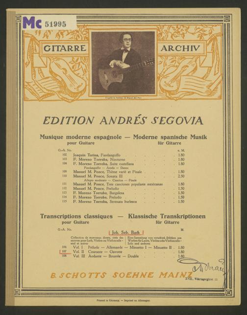Courante und Gavotte / Johann Sebastian Bach. Transcription de Andrés Segovia. Mainz : Schott, [1928], © 1928