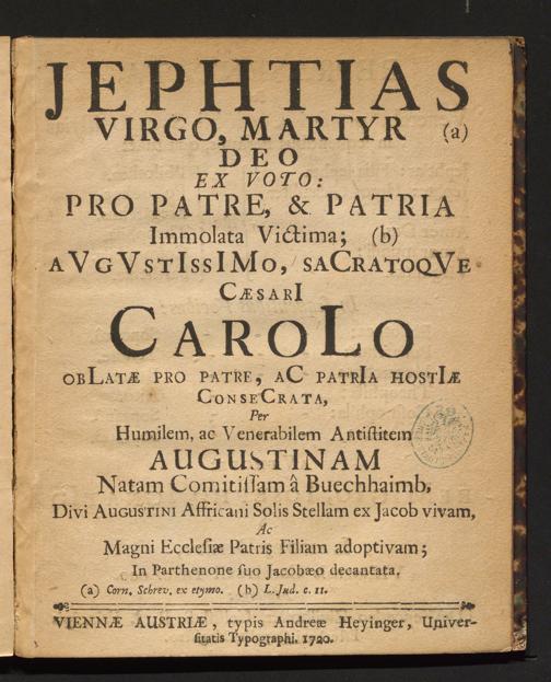 Jephtias : Virgo, Martyr Deo Ex Voto: Pro Patre, & Patria Immolata Victima; Avgvstissimo, Sacratoqve Cæsari Carolo Oblatæ Pro Patre, Ac Patria Hostiæ Consecrata / Per Humilem, ac Venerabilem Antistitem Agustinam Natam Comitissam â Buechhaimb, Divi Augustini Affricani Solis Stellam ex Jacob vivam, Ac Magni Ecclesiæ Patris Filiam adoptivam; In Parthenone suo Jacobæo decantata. [Avthore: Remigio, Iosepho, Ignatio à Langendorff, Viennensis Consistorii Theologo. Musurgo: D. Wenceslao Zivilhoffer, Celsiss. S. R. I. Principis Esterhazi Capellæ Magistro.]. Viennæ Austriæ : typis Andreæ Heyinger, Universitatis Typographi, 1720. Wienbibliothek im Rathaus,