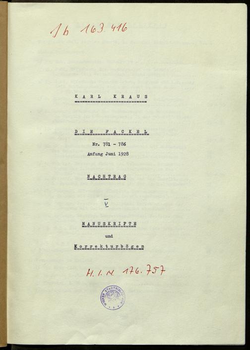 Kraus, Karl: Korrekturbögen (vor dem Umbruch) zur Fackel Nr. 781/786. o.O., 1928.06.°°
