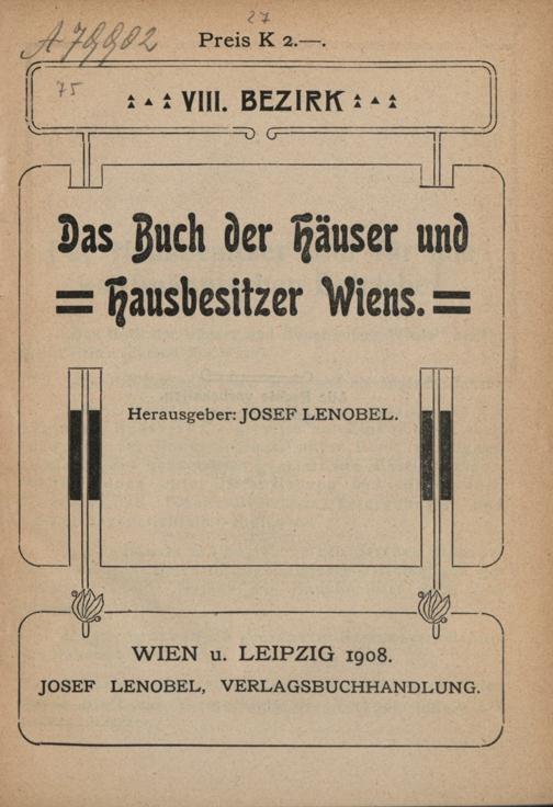 Das Buch der Häuser und Hausbesitzer Wiens. Das Buch der Häuser und Hausbesitzer Wiens / Hrsg.: Josef Lenobel. Wien [u.a.] : Lenobel : 8 / Hrsg.: Josef Lenobel. Wien [u.a.] : Lenobel, 1908. Wienbibliothek im Rathaus, A-79902, https://resolver.obvsg.at/urn:nbn:at:AT-WBR-143057 / Public Domain Mark 1.0