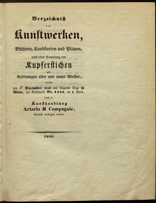 Verzeichniß von Kunstwerken, Büchern, Landkarten und Plänen, nebst einer Sammlung von Kupferstichen und Radirungen alter und neuer Meister, welche den ... December 1843 und folgende Tage in Wien, am Kohlmarkt Nr. 1151, im 2. Stock, durch die Kunsthandlung Artaria & Compagnie, öffentlich versteigert werden