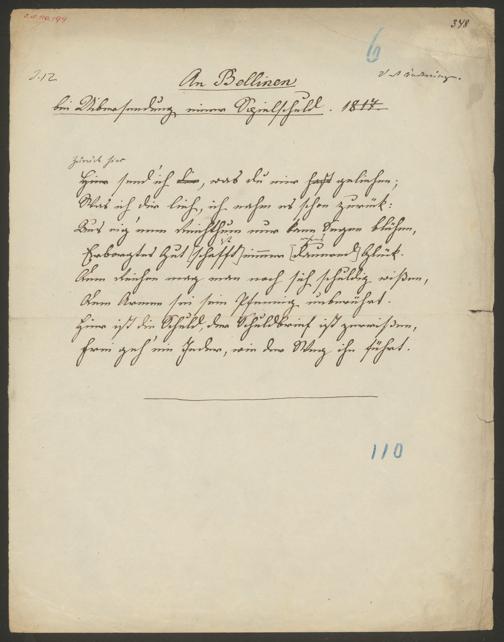 Grillparzer, Franz: An Bellinen bei Uibersendung einer Spielschuld. o.O., 1817