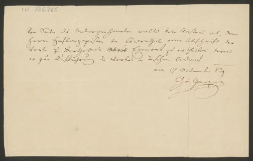 "Von Seite des Unterzeichneten waltet kein Anstand ob, dem Herrn Hofkonzipisten von Löwenthal eine Abschrift der Worte zu Beethovens Egmont zu ertheilen, deren er zur Aufführung des Werkes in Teschen bedarf [...]"
