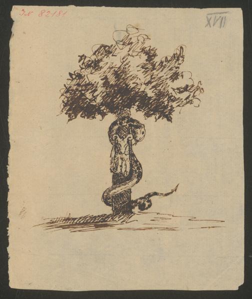 Grillparzer, Franz: Federzeichnung zum 4. Akt der "Argonauten", darstellend Baum mit Vließ und Schlange. o.O., [ohne Jahresangabe]. Wienbibliothek im Rathaus, H.I.N.-82181, https://resolver.obvsg.at/urn:nbn:at:AT-WBR-181567 / Public Domain Mark 1.0