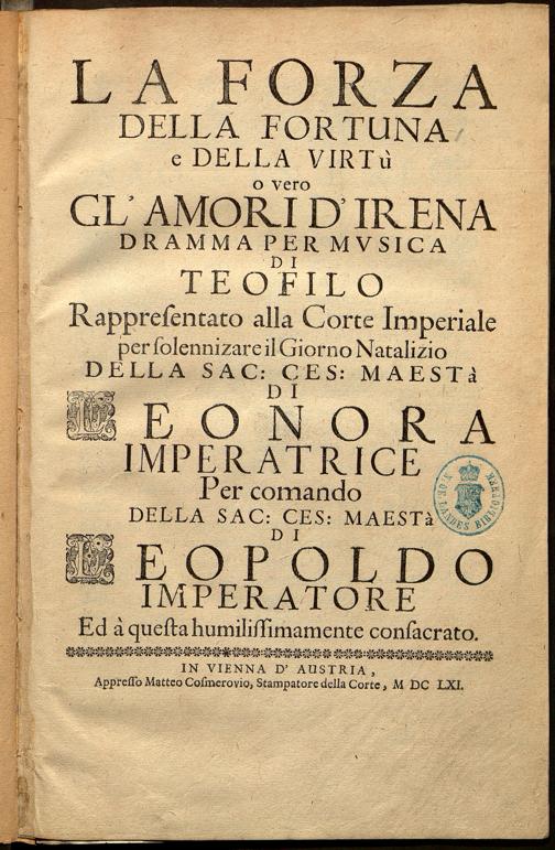La Forza Della Fortuna e Della Virtù o vero Gl'Amori D'Irena : Dramma Per Mvsica / Di Teofilo. [Komp.: Giacomo Tiberti]. Vienna D'Austria : Appresso Matteo Cosmerovio, 1661. Wienbibliothek im Rathaus, B-68562, https://resolver.obvsg.at/urn:nbn:at:AT-WBR-246005 / Public Domain Mark 1.0