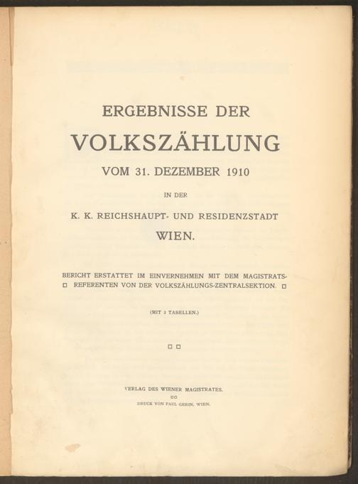 Ergebnisse der Volkszählung vom 31. Dezember 1910 in der k. k. Reichshaupt- und Residenzstadt Wien : Bericht erstattet im Einvernehmen mit dem Magistratsreferenten von der Volkszählungs-Zentralsektion. Wien : Verl. des Wr. Magistrates ; Paul Gerin, 1910. Wienbibliothek im Rathaus, B-65047, https://resolver.obvsg.at/urn:nbn:at:AT-WBR-504667 / Public Domain Mark 1.0