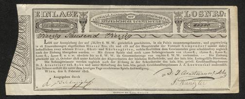 - TitelLos zur Ausspielung der auf 438.577 fl. W.W. gerichtlich geschätzten, in ein Palais zusammengebauten, und gegenwärtig in 26 Zinswohnungen abgetheilten Häuser Nro. 152 und 153 auf der Hauptstrasse der Vorstadt Gumpendorf sammt dabey befindlichen zwey schönen Zier-, Obst- und Küchengärten ... : Die Nebengewinnste werden sogleich nach der Ziehung in der Schreibstube des kais. kön. privil. Grosshandlungshauses D. J. Arnsteiner sel. Sohn und unter Mithaftung des kais. kön. privil. Grosshandlungshauses J. J. Loewenthal ausbezahlt ... ; Einlage 12 Gulden W.W. ; Los Nro. ... ; Wien, den 5. Februar 1818 / D. J. Arnsteiner sel. Sohn