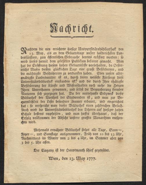 Nachricht : Nachdem die neu errichtete hiesige Universitätsbibliothek den 13. May, als an dem Geburtstage unsrer huldreichsten Landesfürstinn, zum öffentlichen Gebrauche bereits eröffnet worden: so wird dieses hiemit dem gelehrten Publikum bekannt gemacht ... ; Wien, den 13. May 1777