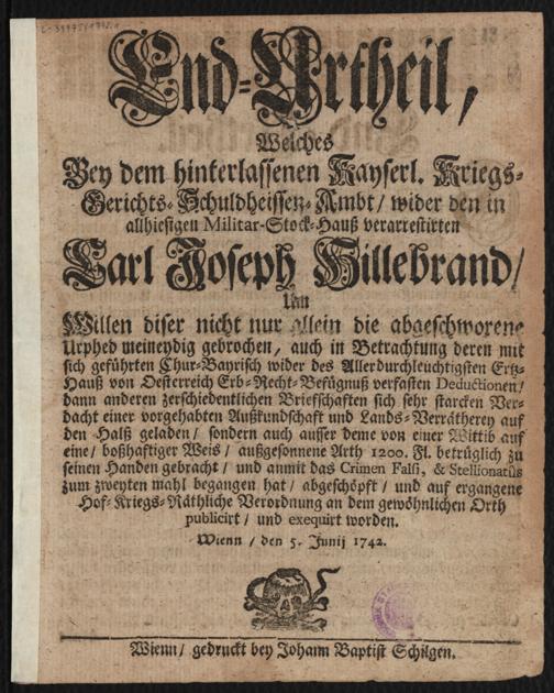 - TitelEnd-Urtheil, Welches Bey dem hinterlassenen Kayserl. Kriegs-Gerichts-Schuldheissen-Ambt, wider den in allhiesigen Militar-Stock-Hauß verarrestirten Karl Joseph Hillebrand : Um Willen diser nicht nur allein die abgeschworene Urphed meineydig gebrochen ... und anmit das Crimen Falsi, & Stellionatus zum zweyten mahl begangen hat, abgeschöpft, und auf ergangene Hof-Kriegs-Räthliche Verordnung an dem gewöhnlichen Orth publicirt, und exequirt worden. Wienn, den 5. Junij 1742