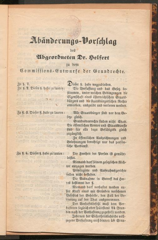 Helfert, Joseph Alexander von: Abänderungs-Vorschlag des Abgeordneten Dr. Helfert zu dem Commissions-Entwurfe der Grundrechte. [s.a. 1849]. Wienbibliothek im Rathaus, A-2676, https://resolver.obvsg.at/urn:nbn:at:AT-WBR-1084026 / Public Domain Mark 1.0