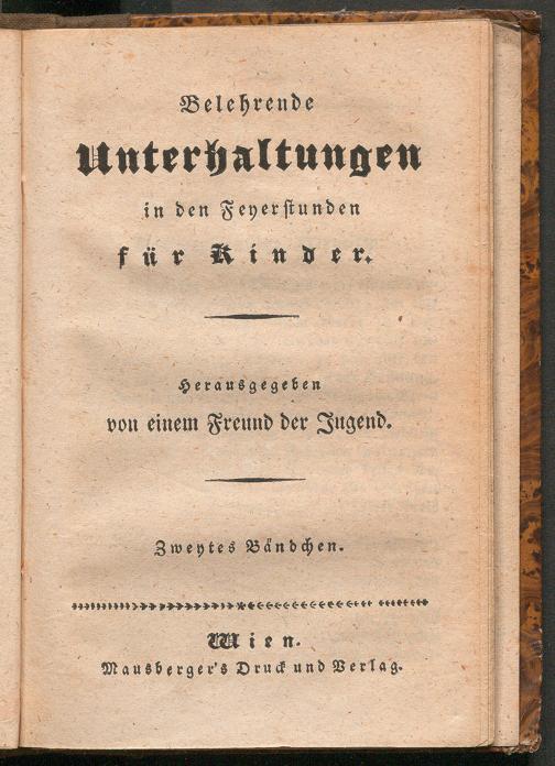 Belehrende Unterhaltungen in den Feyerstunden für Kinder. Belehrende Unterhaltungen in den Feyerstunden für Kinder / herausgegeben von einem Freund der Jugend. Wien : Mausberger's Druck und Verlag, [um 1830]- : 2 / herausgegeben von einem Freund der Jugend. Wien : Mausberger's Druck und Verlag, [um 1830]. Wienbibliothek im Rathaus,