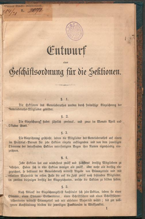 Entwurf einer Geschäftsordnung für die Sektionen. [Wien] : [Druck von Karl Gorischek, vormals L. Grund], [ca. 1850]. Wienbibliothek im Rathaus, A-3715, https://resolver.obvsg.at/urn:nbn:at:AT-WBR-1123505 / Public Domain Mark 1.0