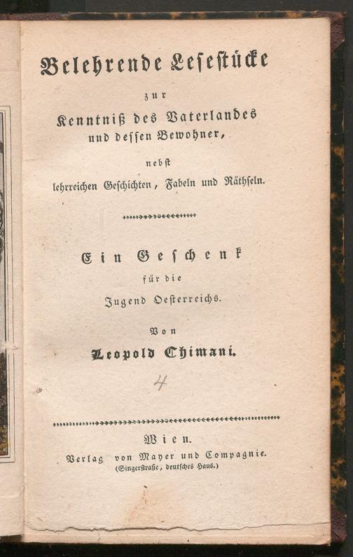 Belehrende Lesestücke zur Kenntniß des Vaterlandes und dessen Bewohner : nebst lehrreichen Geschichten, Fabeln und Räthseln : ein Geschenk für die Jugend Oesterreichs / von Leopold Chimani. Wien : Mayer und Compagnie, 1814. Wienbibliothek im Rathaus, A-8816, https://resolver.obvsg.at/urn:nbn:at:AT-WBR-1124695 / Public Domain Mark 1.0