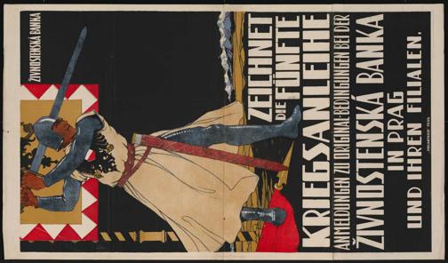 Zeichnet die fünfte Kriegsanleihe. Anmeldungen zu Original-Bedingungen bei der Zivnostenská Banka in Prag und ihren Filialen. Prag : Melantrich, 1916. Wienbibliothek im Rathaus, P-34787 ; PS-A0-0114, https://resolver.obvsg.at/urn:nbn:at:AT-WBR-23345 / Public Domain Mark 1.0