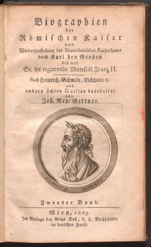 - Titel2 (1805) Biographien der römischen Kaiser : von der Wiederherstellung des abendländischen Kaiserthums durch Karl den Großen bis auf Se. itzt regierende Majestät Franz II. / nach Heinrich, Schmidt, Eichhorn etc. und andern ächten Quellen bearbeitet von Joh. Nep. Gertner