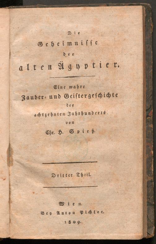 Spiess, Christian Heinrich: Chr. H. Spieß sämmtliche Werke. Die Geheimnisse der alten Ägyptier : Eine wahre Zauber- und Geistergeschichte des achtzehnten Jahrhunderts. Wien : Bey Anton Pichler, 1809-1810 : 3. Wien : Bey Anton Pichler, 1809. Wienbibliothek im Rathaus, A-7880, https://resolver.obvsg.at/urn:nbn:at:AT-WBR-1126034 / Public Domain Mark 1.0