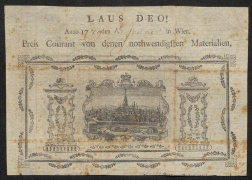 Laus Deo! Anno 17.. den ... in Wien. Preis Courant von denen nothwendigsten Materialien. [Wien], [ca. 1779]. Wienbibliothek im Rathaus, E-377779, https://resolver.obvsg.at/urn:nbn:at:AT-WBR-1127056 / Public Domain Mark 1.0