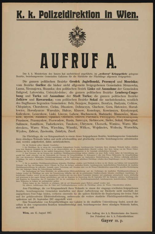 Aufruf A. : Das k.k. Ministerium des Innern hat nachstehend angeführte, im "weiteren" Kriegsgebiete gelegene Bezirke, bezeihungsweise Gemeinden Galiziens für die Rückkehr [...]. Wien, 1917. Wienbibliothek im Rathaus, P-36467 ; PS-A0-0014, https://resolver.obvsg.at/urn:nbn:at:AT-WBR-29625 / Public Domain Mark 1.0