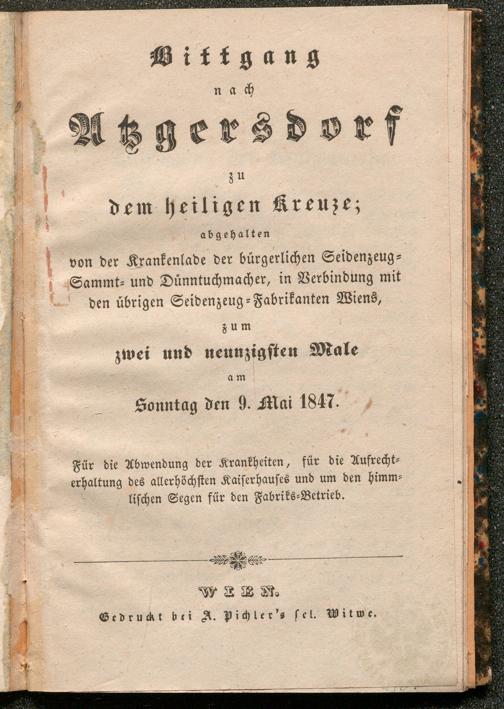 Bittgang nach Atzgersdorf zu dem heiligen Kreuze : abgehalten von der Krankenlade der bürgerlichen Seidenzeug-, Sammt- und Dünntuchmacher, in Verbindung mit den übrigen Seidenzeug-Fabrikanten Wiens, zum [...]. Wien : A. Pichler's Witwe, 1847. Wienbibliothek im Rathaus, A-10433, https://resolver.obvsg.at/urn:nbn:at:AT-WBR-1139035 / Public Domain Mark 1.0