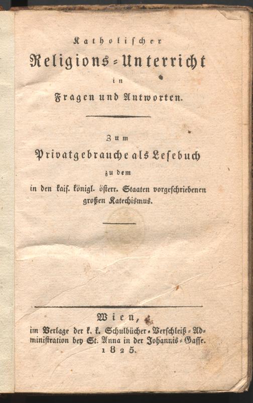 Katholischer Religions-Unterricht in Fragen und Antworten : zum Privatgebrauche als Lesebuch zu dem in den kais. königl. österr. Staaten vorgeschriebenen großen Katechismus. Wien : Schulbücher-Verschleiss, 1825. Wienbibliothek im Rathaus, A-6970, https://resolver.obvsg.at/urn:nbn:at:AT-WBR-1382055 / Public Domain Mark 1.0