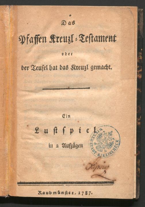 Das Pfaffen Kreuzl-Testament oder der Teufel hat das Kreuzl gemacht : Ein Lustspiel in 2 Aufzügen. Raubmünster [i. e. Wien] : [Wucherer], 1787. Wienbibliothek im Rathaus, A-16317, https://resolver.obvsg.at/urn:nbn:at:AT-WBR-1564428 / Public Domain Mark 1.0
