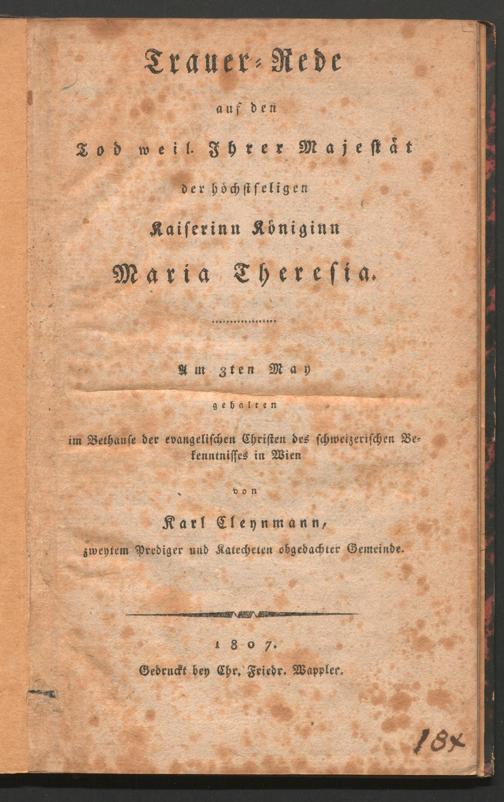 Trauer-Rede auf den Tod weil. Ihrer Majestät der höchstseligen Kaiserinn Königinn Maria Theresia : Am 3ten May gehalten im Bethause der evangelischen Christen des schweizerischen Bekenntnisses in Wien / von Karl Cleynmann, zweytem Prediger und Katecheten obgedachter Gemeinde. [Wien] : Gedruckt bey Chr. Friedr. Wappler, 1807. Wienbibliothek im Rathaus,