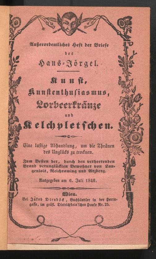 Weis, Johann Baptist: Außerordentliches Heft der Briefe des Hans-Jörgel : Kunst, Kunstenthusiasmus, Lorbeerkränze und Kelchpletschen : Eine lustige Abhandlung, um die Thränen des Unglücks zu trocknen. Zum Besten der, durch den [...]. Wien : Bei Jakob Dirnböck, Buchhändler in Wien, Herrngasse, im gräfl. Dietrichstein'schen Hause Nr. 25, 1846. Wienbibliothek im Rathaus,