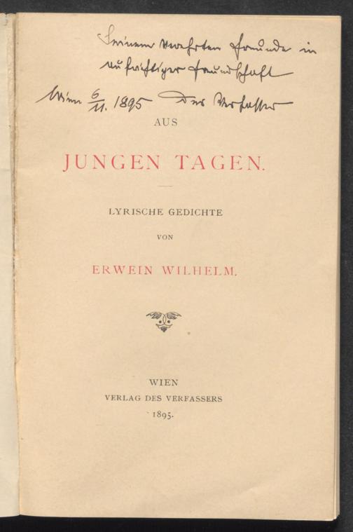Aus jungen Tagen : lyrische Gedichte / von Erwein Wilhelm [i.e. Erwein von Höpler]. Wien : Selbstverl. ; Brünn : Rudolf M. Rohrer, 1895. Wienbibliothek im Rathaus, A-386044, https://resolver.obvsg.at/urn:nbn:at:AT-WBR-1697258 / Public Domain Mark 1.0