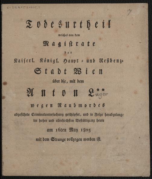 - TitelTodesurtheil welches von dem Magistrate der kaiserl. königl. Haupt-und Residenz- Stadt Wien über die, mit dem Anton L** wegen Raubmordes abgeführte Criminaluntersuchung geschöpfet, und in Folge herab-gelangter hoher und allerhöchsten Bestättigung heute am 16ten May 1805 mit dem Strange vollzogen worden ist