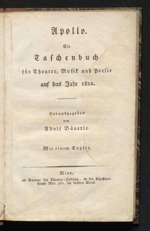 Apollo : ein Taschenbuch für Theater, Musik und Poesie auf das Jahr ... / hrsg. von Adolf Bäuerle. Wien : Theater-Zeitung, 1812[?], 1812-1812. Wienbibliothek im Rathaus, A-37038, https://resolver.obvsg.at/urn:nbn:at:AT-WBR-147007 / Public Domain Mark 1.0
