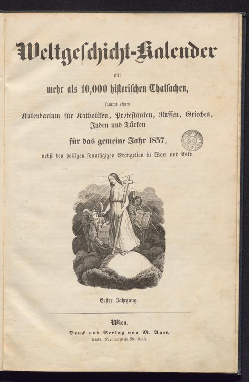 [...].Weltgeschicht-Kalender : mit mehr als 10,000 historischen Thatsachen, sammt einem Kalendarium für Katholiken, Protestanten, Russen, Griechen, Juden und Türken für das gemeine Jahr [...]. Wien : Auer, 1.1857[1856] nachgewiesen, [1856]-. Wienbibliothek im Rathaus, A-362443, https://resolver.obvsg.at/urn:nbn:at:AT-WBR-233460 / Public Domain Mark 1.0