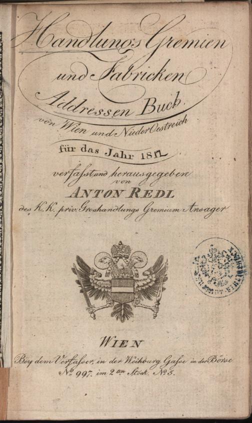 Handlungs-Gremien und Fabriken Adressen Buch : der Haupt- und Residenzstadt Wien ; dann mehrerer Provincialstädte für das Jahr ... / verf. und hrsg. von Anton Redl. Wien : Eigenverl. Redl, 1812 - 1822 nachgewiesen, 1812-1822. Wienbibliothek im Rathaus, A-3179, https://resolver.obvsg.at/urn:nbn:at:AT-WBR-853 / Public Domain Mark 1.0