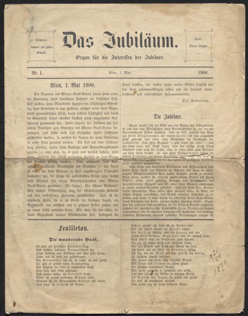 Das Jubiläum : Organ für die Interessen der Jubilare / red. von Arpad Sor und J. Turnauer. Wien : Wiener Bank-Verein ; Wien : Holzhausen, 1900,1(1. Mai 1900) nachgewiesen, 1900-. Wienbibliothek im Rathaus, E-375633, https://resolver.obvsg.at/urn:nbn:at:AT-WBR-880425 / Public Domain Mark 1.0