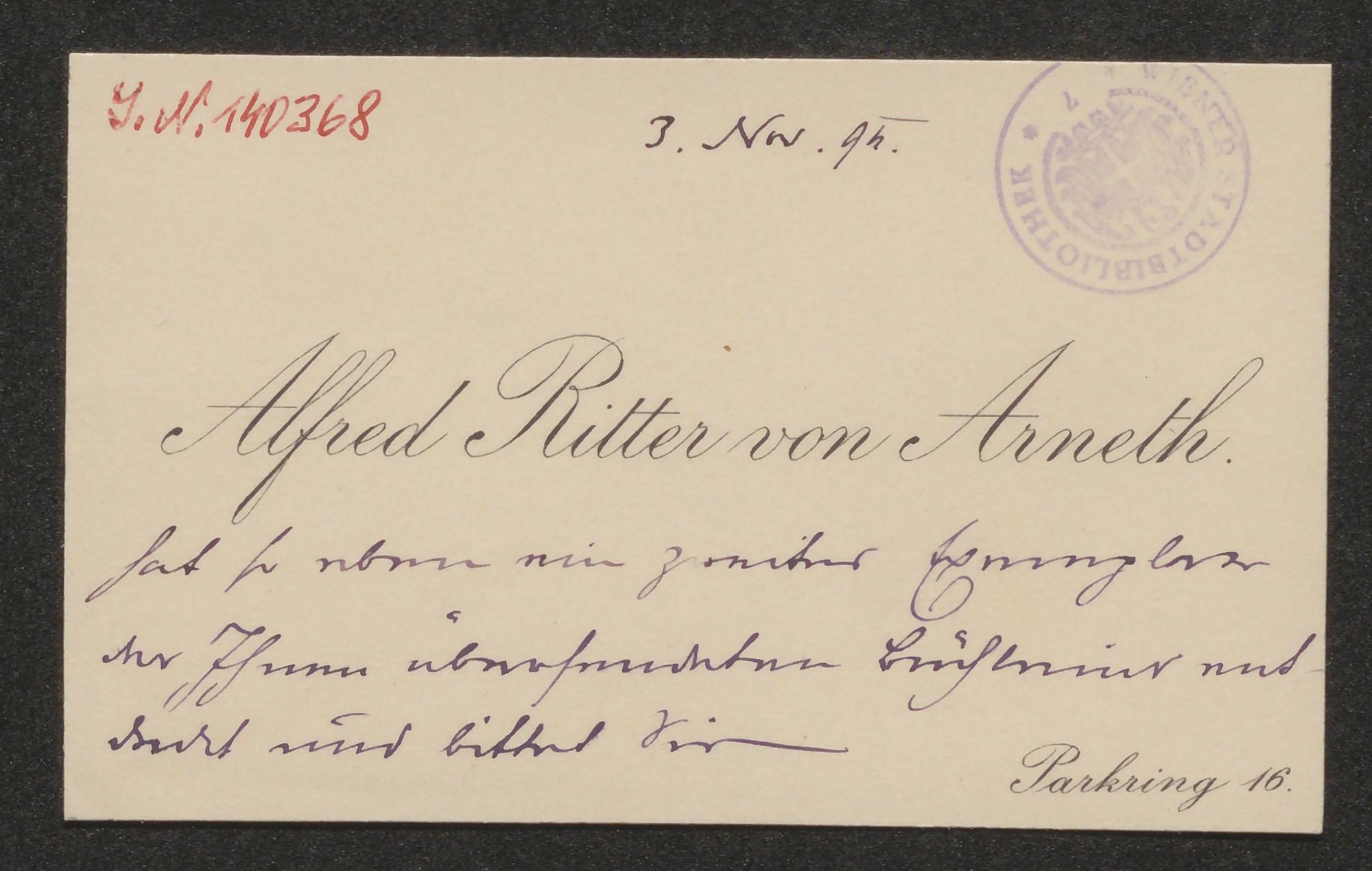 Visitenkarte an Hans Krticzka von Jaden