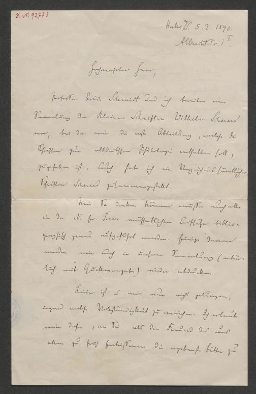 Burdach, Konrad: Brief an Ludwig Speidel. Halle, Saale, 5.2.1890