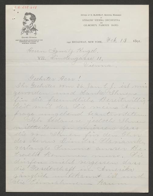 Blakely, David: Diktatbrief an Ignaz Kugel. New York, NY, 13.2.1891