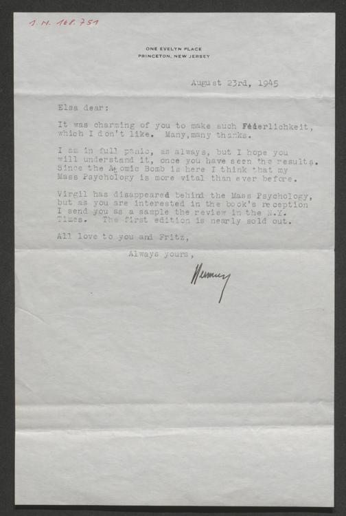 Broch, Hermann: Brief an Elsa Spitzer. Princeton, NJ, 23.8.1945