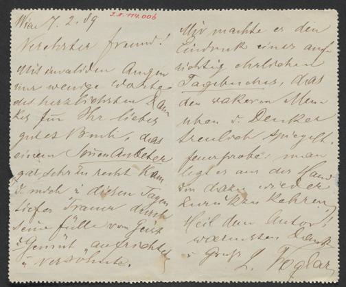 Foglar, Ludwig: Billett an Faust Pachler. o.O., 7.2.1889