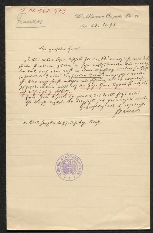 Franzos, Karl Emil: Brief an Franz Karl Ginzkey. o.O., 23.4.1895