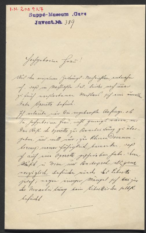Fránek, Gabriel: Brief an Sophie Rosina von Suppé. Raab, 24.5.1895