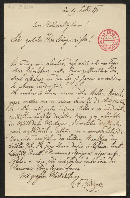 Blatt 1r: "[...] Ich verehre in Ihnen einen edlen Ritter. Wegelagerer wollten mir u. meiner Familie die Ehre rauben [...] Sie machten die Wegelagerer unschädlich u. retteten mir u. meiner Familie die Ehre, unter den Gütern der Cultur-Menschen das höchste Gut [...]"