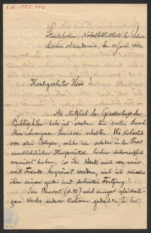 Grönblad, Carl: Brief an Michael Holzmann. Stockholm, 11.6.1902