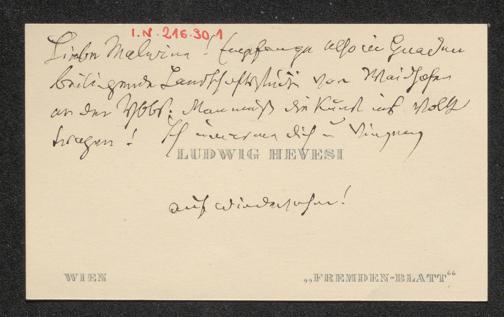 Hevesi, Ludwig: Visitenkarte an Malwine Chiavacci. o.O., o.D.