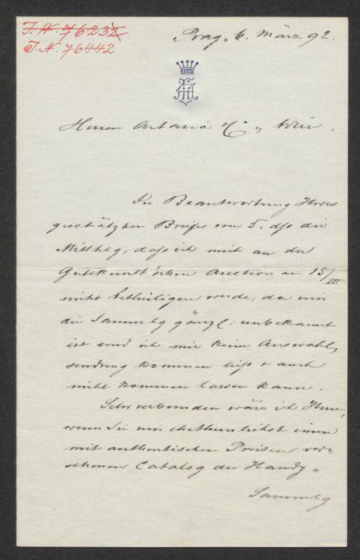 Lanna, Adalbert: Brief an Artaria und Compagnie. Prag, 6.3.1892