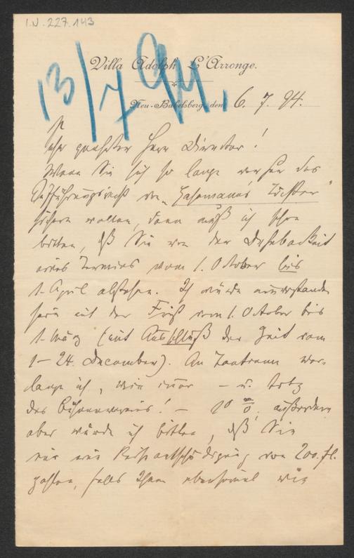 L'Arronge, Adolph: Brief an Emmerich Bukovics von Kiss-Alacska. Neubabelsberg, 16.10.1894. Wienbibliothek im Rathaus, H.I.N.-227143, https://resolver.obvsg.at/urn:nbn:at:AT-WBR-1032282 / Public Domain Mark 1.0