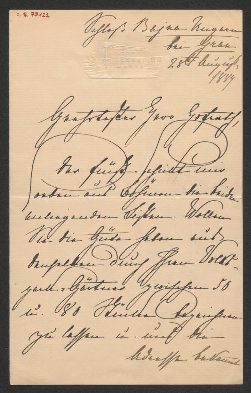 Metternich-Sándor, Pauline: Brief an Wilhelm Franz Exner. Bajna, 28.8.1887