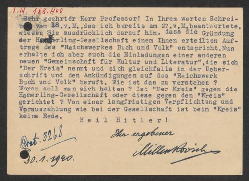 Millenkovich-Morold, Max von: Postkarte an Max Stebich. Wien, 30.1.1940