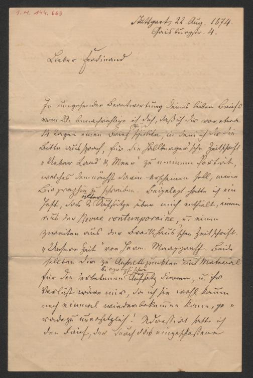 Müller, Otto: Brief an Ferdinand Lotheißen. Stuttgart, 22.8.1874